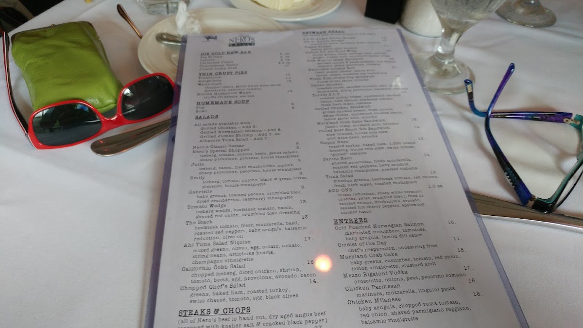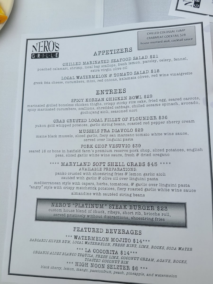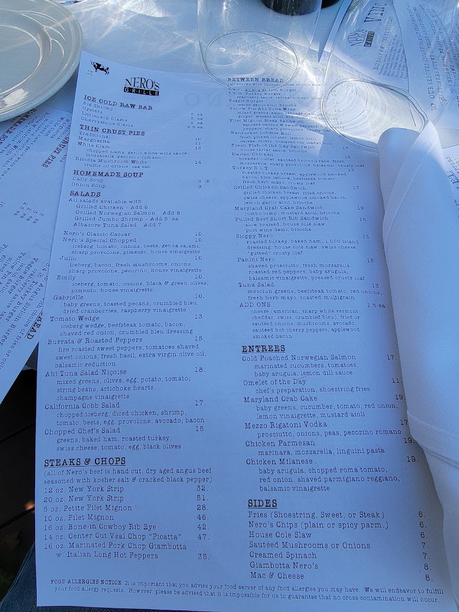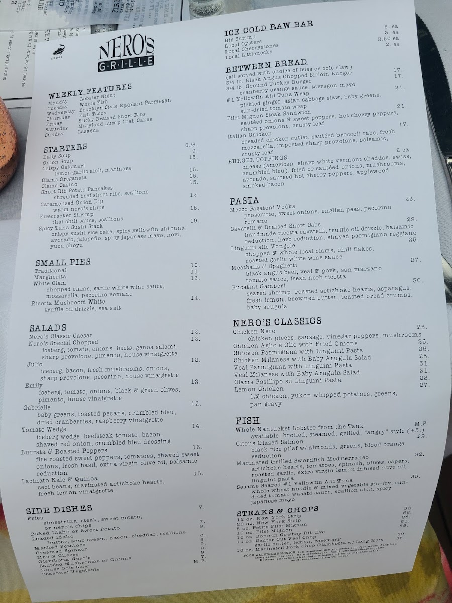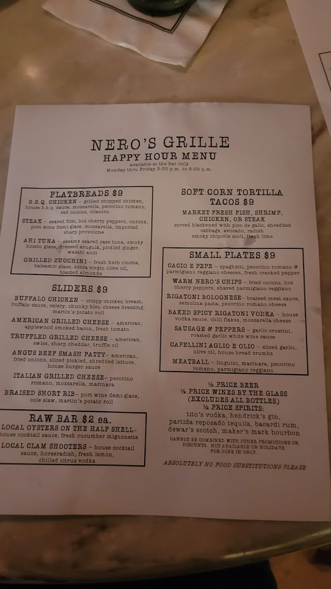 From hearty steaks like the Cowboy Steak and Filet Mignon to lighter fare such as the Salad Nicoise with Ahi Tuna or Clams Posillipo over linguini, the menu is designed to suit both casual lunches and more leisurely dinners. Fresh seafood items like oysters and crab-crusted flounder bring a coastal touch, while shareable starters like warm Nero’s chips and calamari fritti complement conversations at the bar or an inviting evening meal.